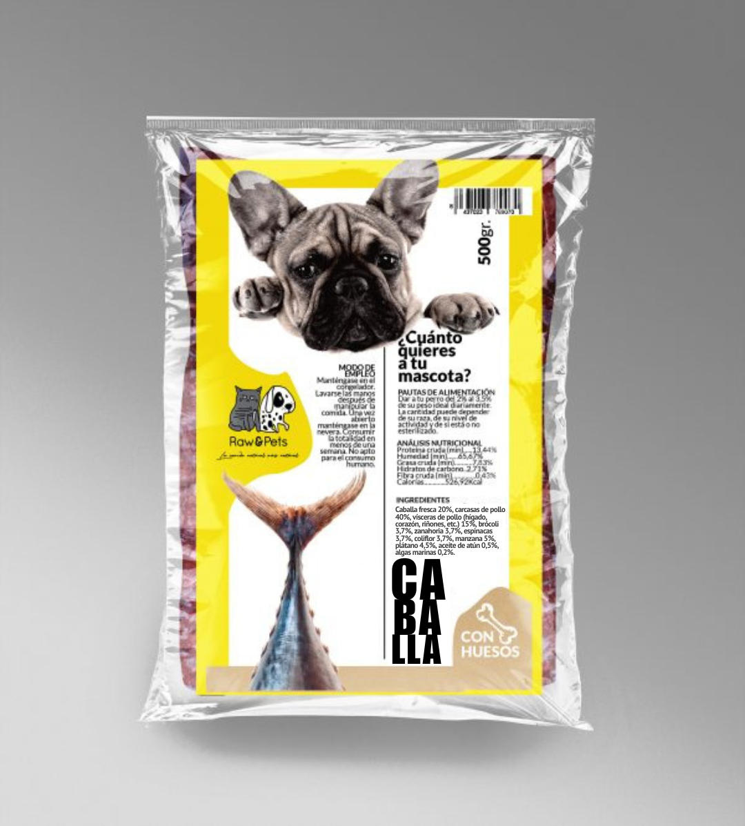 La Caballa es uno de los pescados más saludables y nutritivos. Este menú es una fuente rica en ácidos grasos Omega 3 y Omega 6, que refuerzan el sistema inmunológico, mejoran la salud de la piel y el pelaje, y ayudan a reducir el colesterol y los triglicéridos, disminuyendo el riesgo de enfermedades cardiovasculares. Además, aporta proteínas de alto valor biológico (23 g por cada 100 g), esenciales para el desarrollo muscular y la energía diaria de tu mascota.